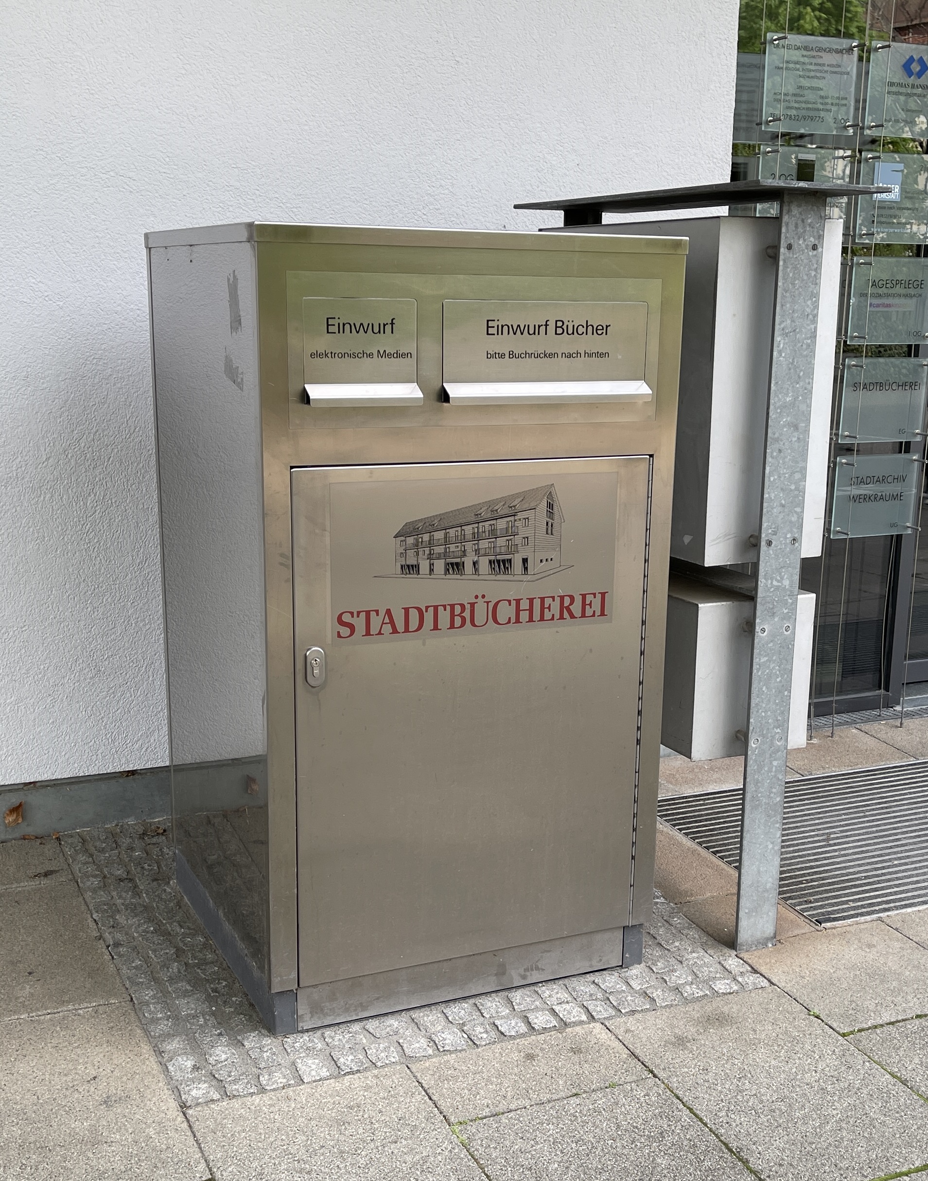 Außerhalb der Öffnungszeiten können Sie entliehene Medien über den Rückgabecontainer links beim Haupteingang des Bürgerhauses abgeben. Er hat 2 Einzugsklappen: eine für Bücher und eine für AV-Medien. Legen Sie die Medien bitte einzeln ein, um Beschädigungen zu vermeiden.