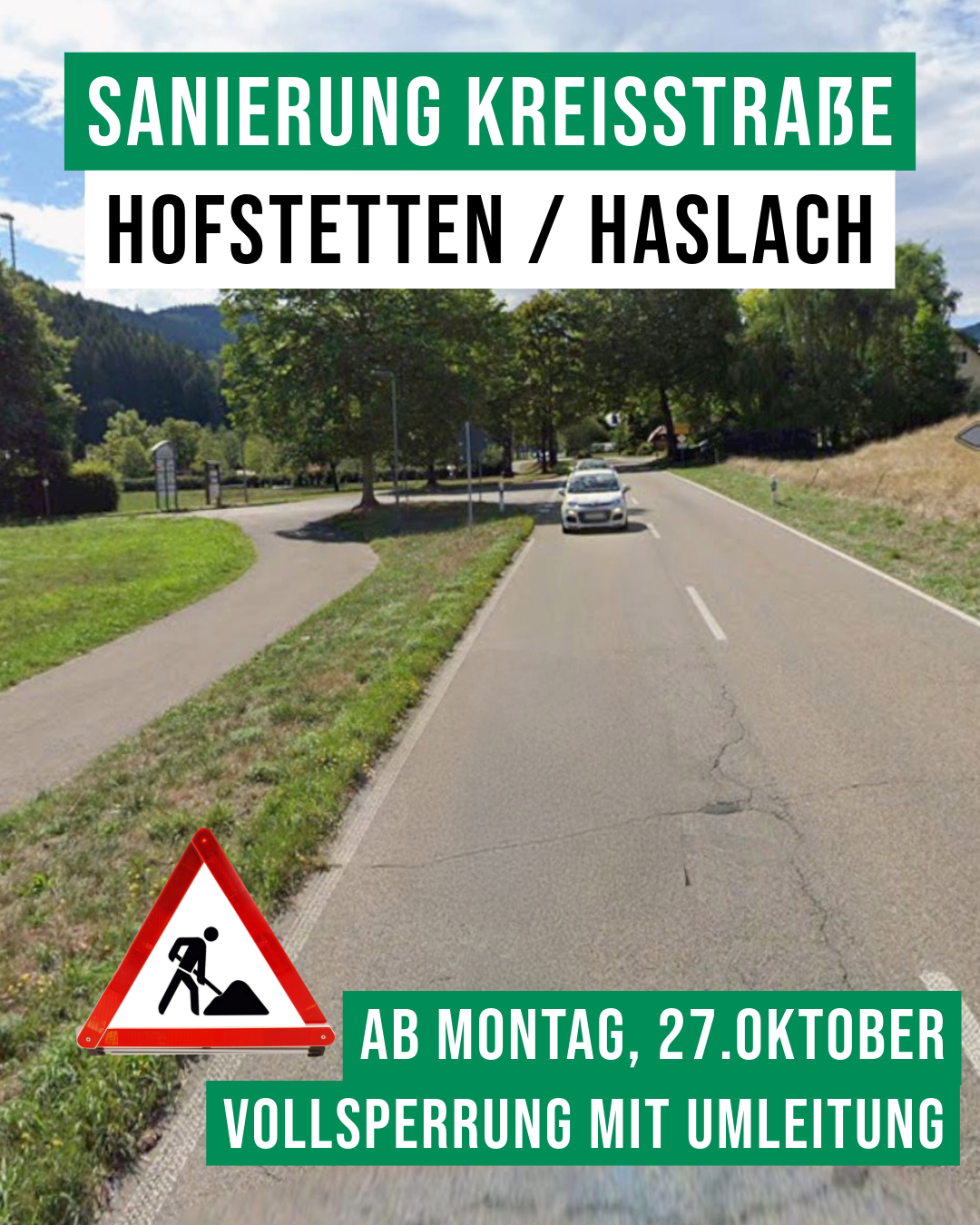 Das Straßenbauamt des Ortenaukreises erneuert in den Herbstferien die Fahrbahndecke der Kreisstraße K 5358 zwischen Hofstetten und Haslach. Die Arbeiten beginnen am Montag, 27. Oktober, um 7 Uhr und dauern voraussichtlich bis Freitag, 31. Oktober 2025, um 17 Uhr.