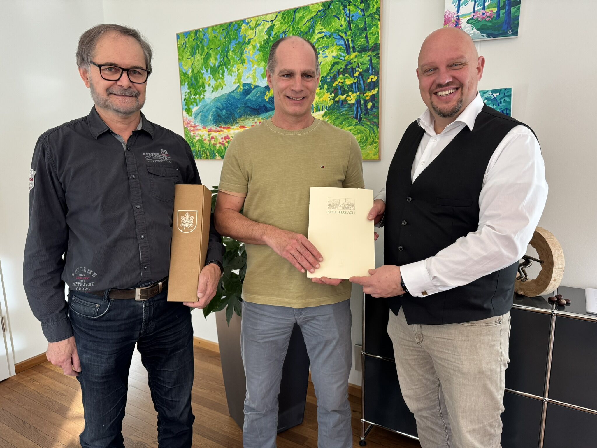 Bürgermeister Armin Hansmann (rechts) übereichte in seinem Amtszimmer Gerd Flach (Bildmitte) nach Unterschriftenleistung die offizielle Ernennungsurkunde und bedankte sich bei seinem Vorgänger Erwin Schmid (links), dessen eigentliche Verabschiedung Mitte Januar stattfinden wird, für die geleisteten Dienste. Die Hausmeistertätigkeit Gerd Flachs in der Stadthalle wird von Matthias Schätzle übernommen.