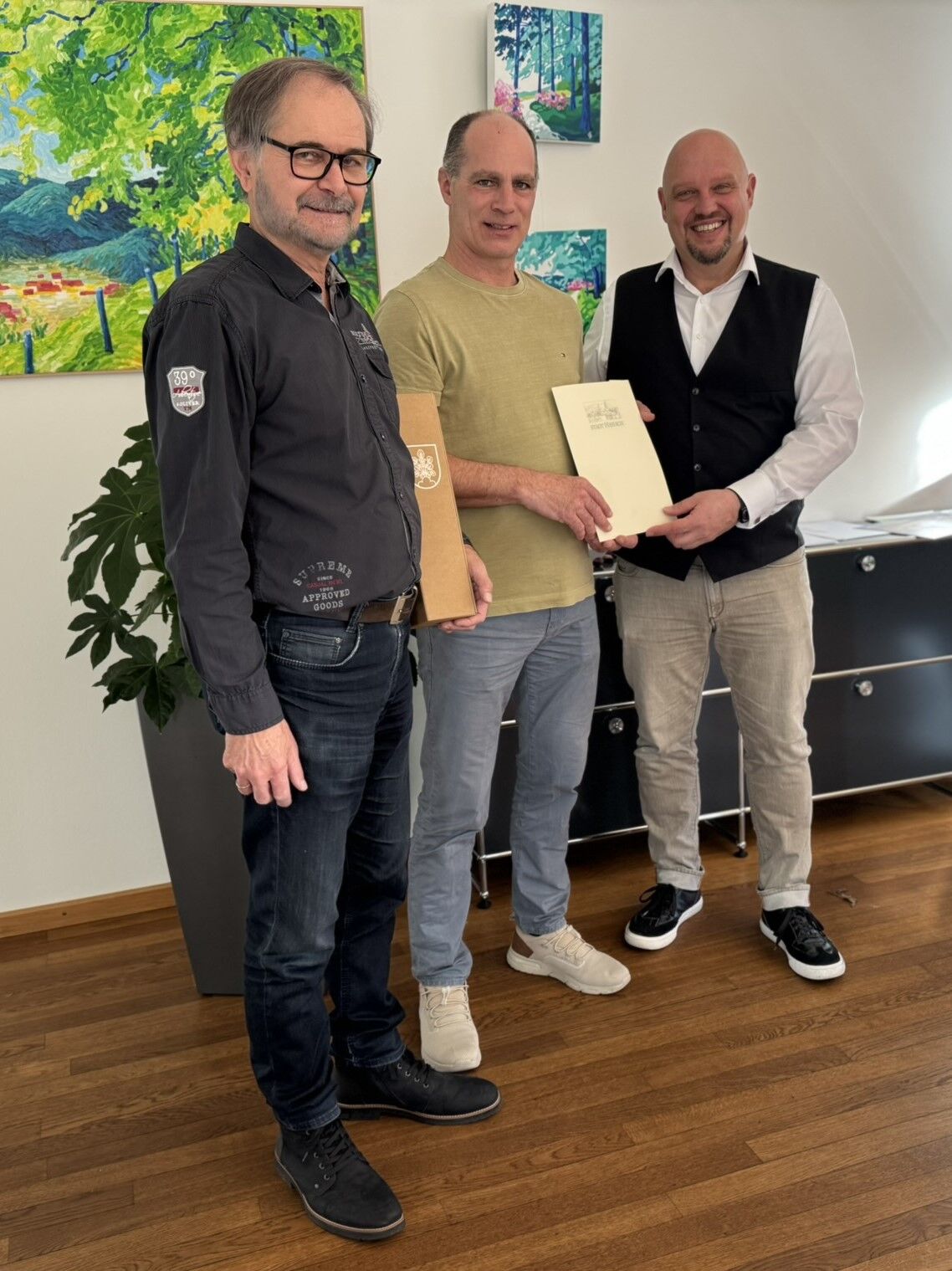 Bürgermeister Armin Hansmann (rechts) übereichte in seinem Amtszimmer Gerd Flach (Bildmitte) nach Unterschriftenleistung die offizielle Ernennungsurkunde und bedankte sich bei seinem Vorgänger Erwin Schmid (links), dessen eigentliche Verabschiedung Mitte Januar stattfinden wird, für die geleisteten Dienste. Die Hausmeistertätigkeit Gerd Flachs in der Stadthalle wird von Matthias Schätzle übernommen.